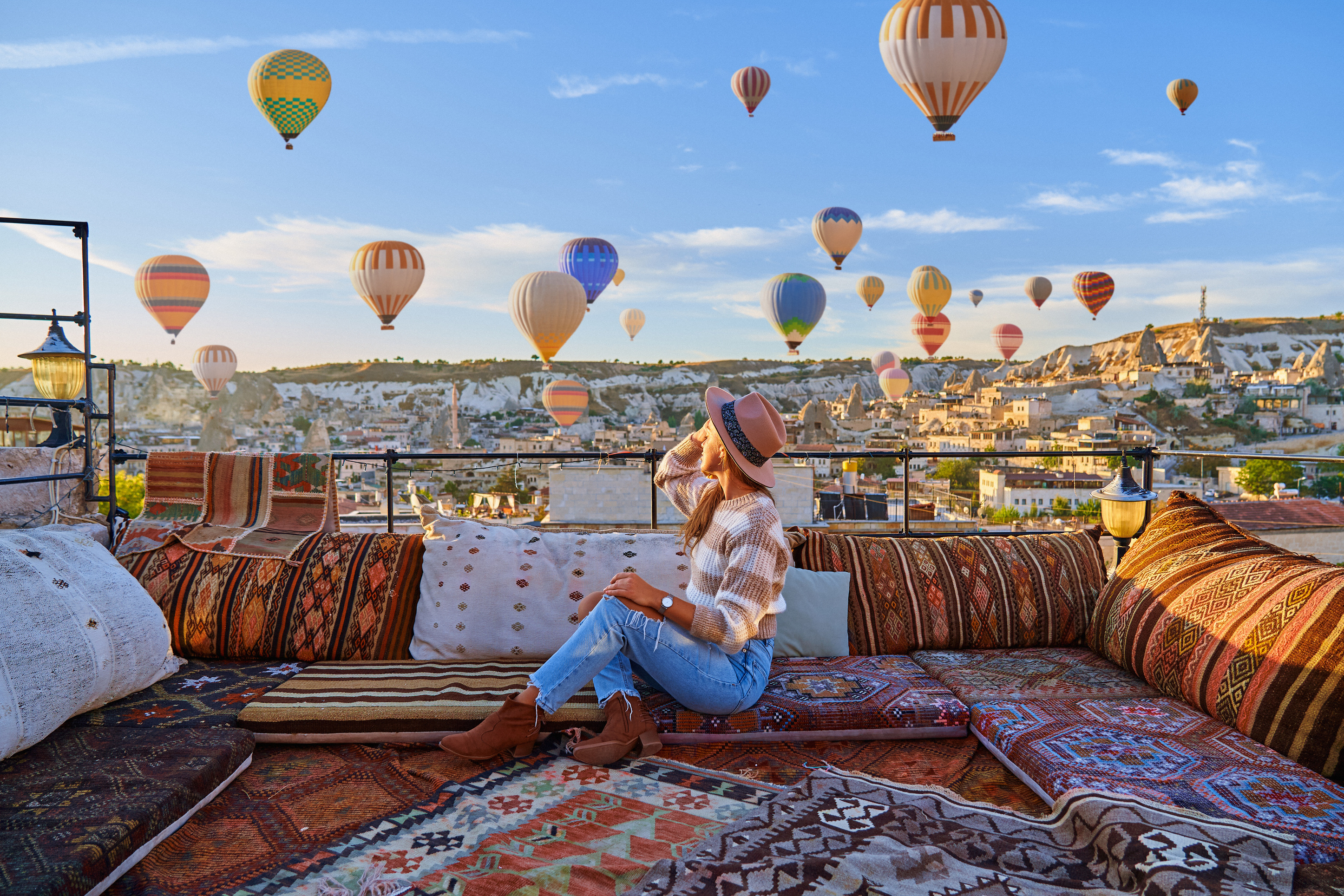 静かな大地の上空には色とりどりの気球がゆったりと舞い上がり、空を埋め尽くす姿は絵画のように幻想的。