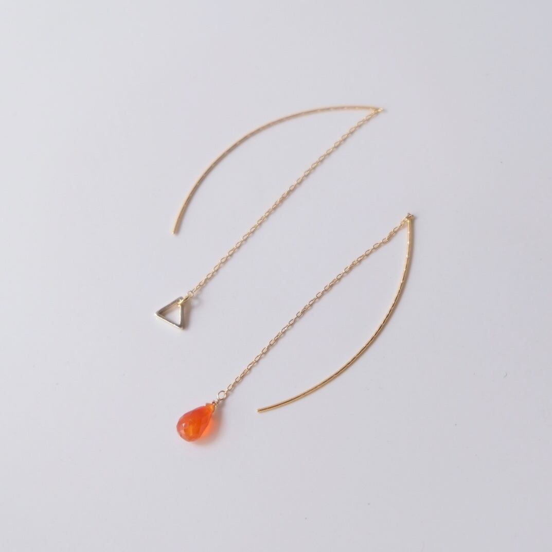 シンプルなトライアングルとドロップ型の天然石を組み合わせたアシンメトリーなピアス・イヤリングです。