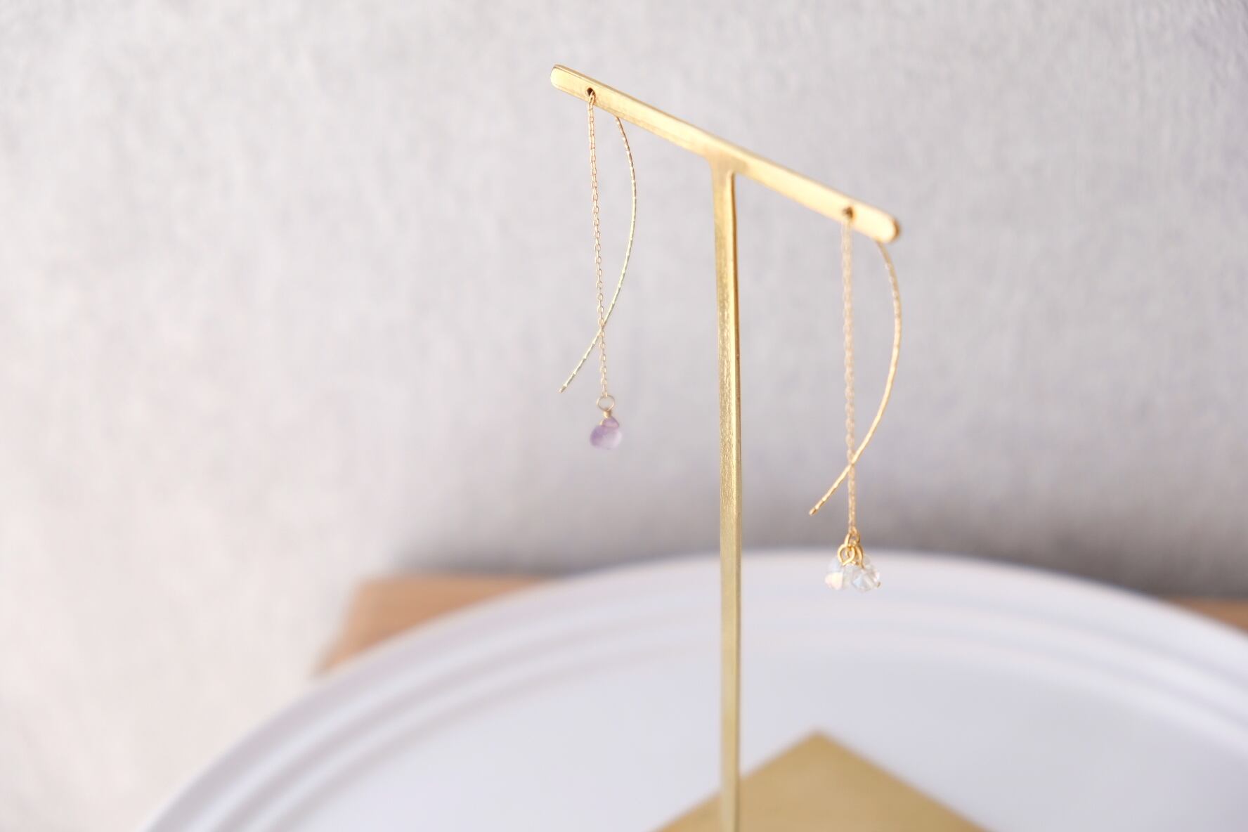 マロン型の天然石とオーラ加工のクォーツを使い、線香花火”Sparkler”を模したアシンメトリーなアメリカンピアスです。